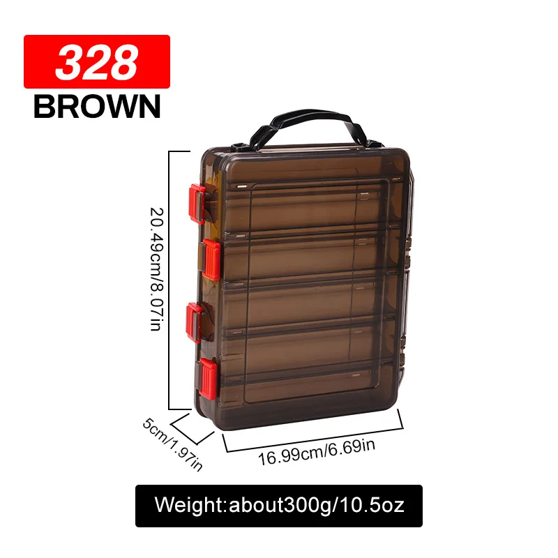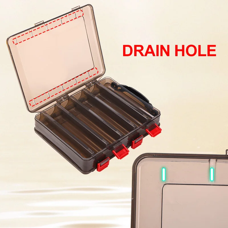 * Portable fishing tackle box, waterproof and double-sided with clear easily viewable lid.